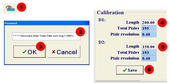 將測(cè)微尺放到物鏡下,調(diào)整焦距至清晰. 點(diǎn)擊校準(zhǔn)圖標(biāo),輸入密碼:當(dāng)日日期,如果是1月2日,則密碼為0102,校準(zhǔn)窗口將出現(xiàn)。